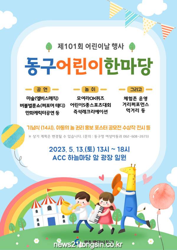 광주 동구는 제101회 어린이날을 기념해 오는 13일 국립아시아문화전당 하늘마당 광장 일원에서 ‘동구 어린이 한마당’을 개최한다고 밝혔다.