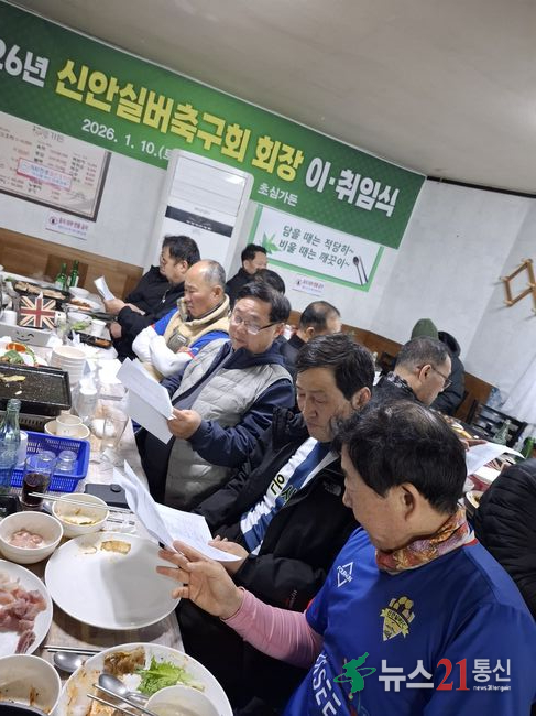 [뉴스21 통신=박철희 ] 아름다운 1004의섬 전남 신안실버축구회가 2026년 1월 10일 토요일, 신안군에서 회장 이·취임식을 열고 새로운 출발을 알렸다. 이번 행사에는 회원 80여 명이 참석해 성황을 이뤘으며, 신안군축구협회 김성윤 회장이 직접 격려차 방문해 의미를 더했다.이날 행사에서는 최영훈 회장이 임기를 마치고 이임했으며, 김영.