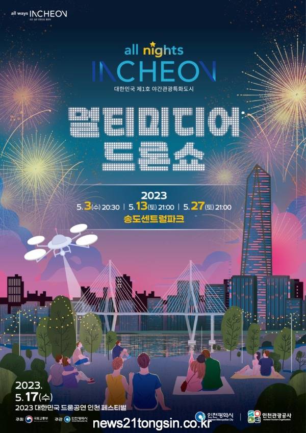 인천광역시(시장 유정복)와 인천관광공사(사장 백현, 이하 공사)는 5월 3일 저녁 송도 센트럴파크에서 ‘올 나이츠 인천(all nights INCHEON)’ 멀티미디어 드론쇼를 개최했다고 밝혔다. 드론쇼는 오는 13일과 27일에도 송도 센트럴파크에서 열린다.