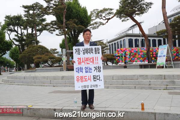 4일 거창군의회 신중양 의원은 군청 앞 로터리에서 도립 거창대학과 남해대학 통합을 반대하는 1인 피켓 시위에 나섰다.
