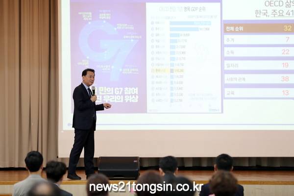 이날 오후 광산구청 7층 윤상원홀에서 ‘세계의 미래를 가장 먼저 만나는 대한민국’을 주제로 공직자 역량강화 강연에 나선 이광재 사무총장은 “우리가 직면한 다양한 도전을 해결할 수 있는 능력이 미래의 경쟁력”이라며 이같이 말했다.