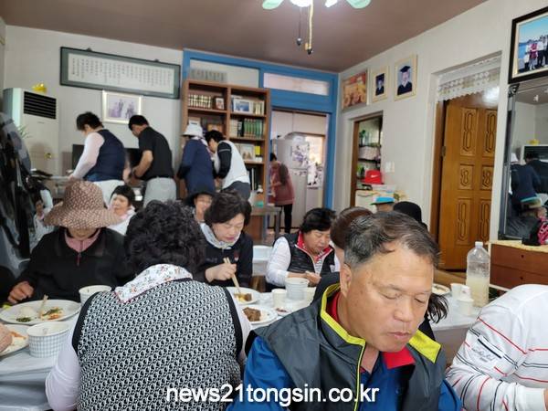 ▲ 홍재식 회장 자택에서 파크골프 친선 경기 후 회원들이 점심식사를 하고 있다.이에 군위군은 2025년까지 군비 150억 원을 투입해 25만㎡ 전국 최대 규모의 천연잔디 파크골프장 180홀, 클럽하우스, 부대시설 등을 조성할 계획이다.