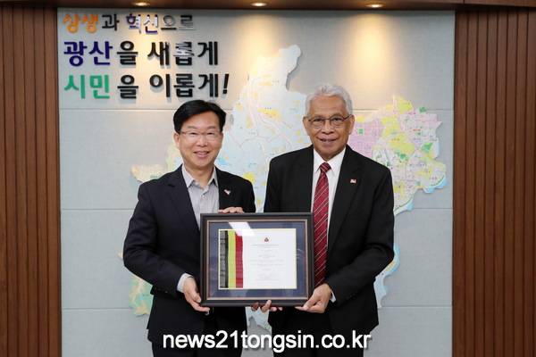 광주 광산구가 22일, 동티모르 민주공화국 정부로부터 감사장을 받았다. 그레고리우 조제 다 콘세이상 페헤이라 드 소자 주한 동티모르 대사는 이날 오전 광산구청을 찾아 박 구청장에게 감사장을 수여했다.