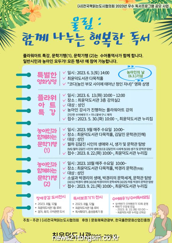 6월에는 ▲농아인의 날(6월 3일) 기념 영화상영과 ▲농아인이 진행하는 플라워아트 특강(6월 13일)이 진행되며, 플라워아트 특강은 최윤덕도서관 누리집에서 5월 30일(화) 10시부터 선착순 수강 신청을 받는다.