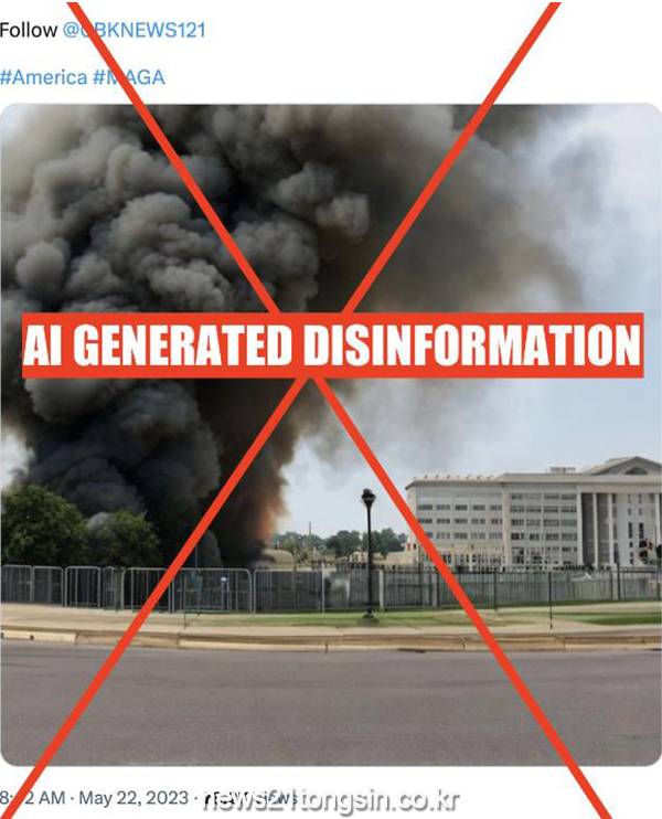 미국 NBC 방송 등에 따르면 현지 시각 22일 미국 워싱턴DC에 있는 국방부 청사 근처에서 폭발이 발생했다고 주장하는 가짜 사진이 트위터에 한동안 돌았다.