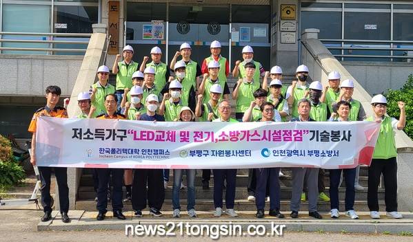 부평구(구청장 차준택) 자원봉사센터는 지난 20일 부평3동에 위치한 취약계층 5가구를 대상으로 LED 전등 교체와 안전점검 지원하는 ‘크리닝봉사단’ 활동을 진행했다. 이번 활동은 한국폴리텍대학 인천캠퍼스 전기에너지시스템학과와 인천부평소방서 협업으로 이뤄졌다.
