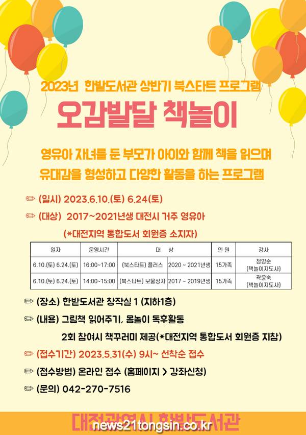 신청은 5월 31일(수)부터 한밭도서관 홈페이지에서 선착순으로 접수하며, 기타 자세한 사항은 한밭도서관 자료운영과(☎042-270-7516)로 문의하면 된다.