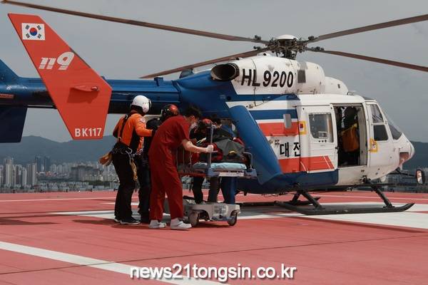 이날 훈련은 응급환자 이송 역량을 강화하기 위해 헬리패드가 설치되어 있지 않은 충남대학교병원 권역응급의료센터로 응급환자 이송 시 인근 의료재활센터 운동장에 착륙 후 119구급차로 연계 이송하는 훈련으로 진행됐다.