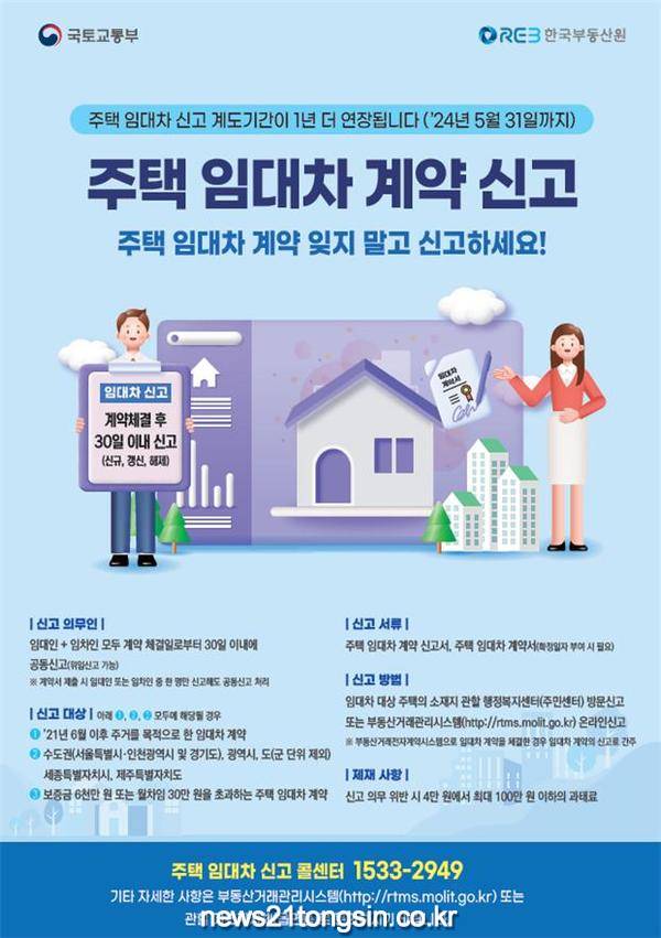 광주광역시는 국토교통부의 결정으로 ‘주택 임대차 신고제’ 계도기간을 올해 5월 31일에서 2024년 5월 31일로 연장한다고 밝혔다.