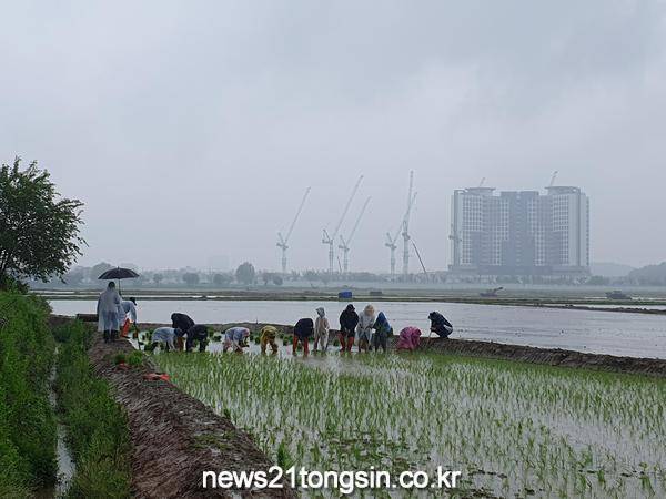 궂은 날씨에도 불구하고 가족 단위 참가자들은 직접 손 모내기를 체험하며 선조들의 전통 모내기 방법, 쌀의 생산과정 등을 배우는 시간을 가졌다.