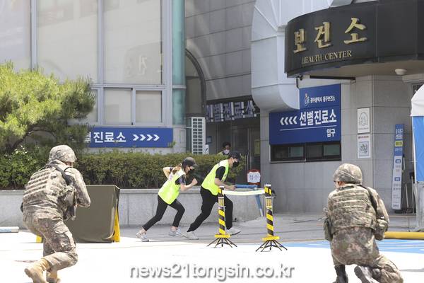 광주 동구는 올해 상반기 충무훈련 기간인 지난 25일 동구청사 별관에서 ‘공공청사 드론 테러 가정 피해복구 훈련’을 진행했다고 밝혔다.