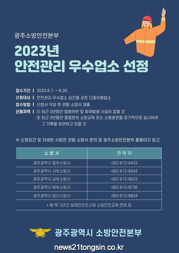 광주광역시소방안전본부는 오는 6월 30일까지 자율안전관리 문화 정착을 위한 2023년 안전관리 우수 다중이용업소를 모집한다.