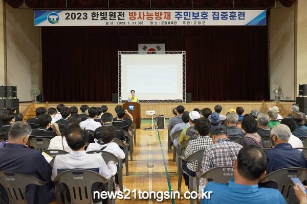뉴스21통신전북/김문기기자=고창군이 31일 오후 고창군립체육관에서 한빛원전 방사능재난을 대비해 2023년 방사능방재 주민보호 집중훈련을 실시하였다.