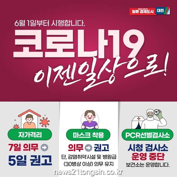 대전시는 6월 1일부터 코로나19 방역수칙 준수 의무를 대폭 완화하고, 코로나 확진자의 격리가 의무에서 권고로 전환된다고 밝혔다.