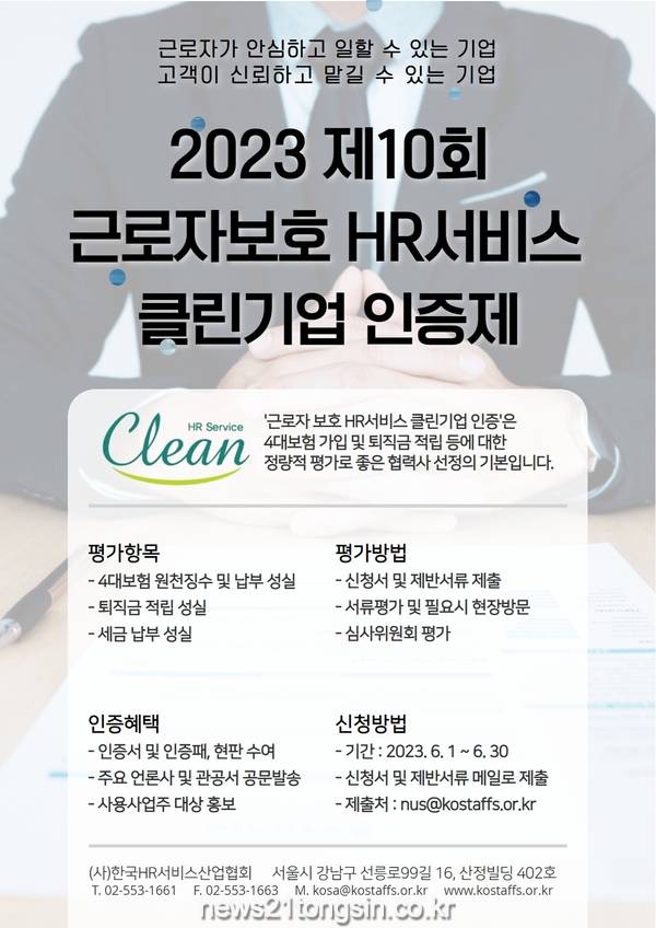 한국HR서비스산업협회(회장 김정현)는 6월 30일까지 ‘2023 근로자 보호 HR서비스 클린기업 인증’ 신청을 받는다고 밝혔다.