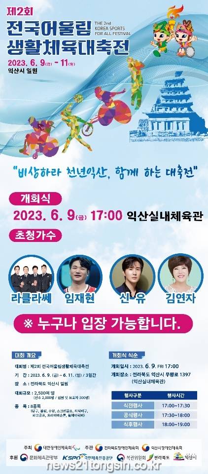 익산시장애인체육회(회장 정헌율 익산시장)는 장애인 체육발전에 대한 시의 의지를 반영해 대회 유치에 성공하며‘제2회 전국어울림생활체육 대축전’을 오는 9일부터 11일까지 3일간 익산에서 치른다.