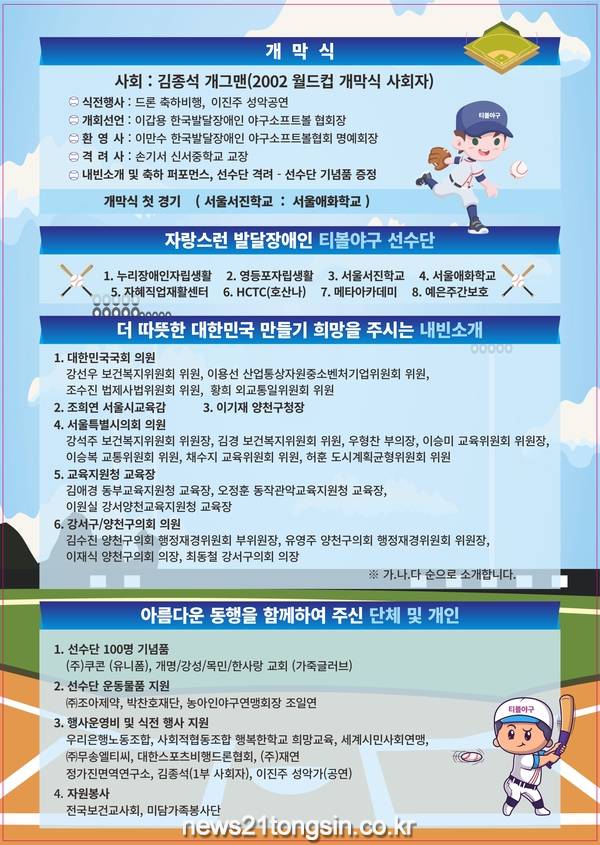 이번 대회에 참여하는 100명 선수단 전체에게, 개명․강성․목민․한사랑교회에서 가죽 글로브를, ㈜쿠콘에서 선수단 유니폼을, 후원하는 등 다양한 지역사회 기관에서 함께한다. 또한, 대회 취지에 공감하는 국회의원, 교육감, 구청장, 교육장, 시․구의원, 종교계, 기업인, 각종 단체장 등의 다양한 분들이 자리를 함께한다.
