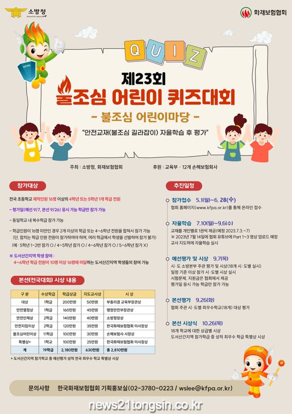 신현호 방호구조과장은 “어린이들이 올바른 화재 및 생활안전 의식을 함양한 바람직한 사회구성원으로 성장할 수 있도록 퀴즈대회에 많은 관심과 참여 부탁드린다”고 전했다.