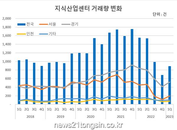 보고서에 따르면 전국 지식산업센터의 거래 건수는 2022년 12월 203건으로 최근 5년간 최저치를 기록한 후 2023년 2월 301건, 3월 360건으로 거래량이 점점 늘어나고 있다. 4월에는 328건으로 거래량이 다소 주춤하고 있지만, 이는 상승장 이전에 나타나는 완만한 저항선 수준으로 분석됐다.