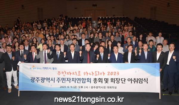 광주광역시 주민자치연합회 총회 및 회장단 이‧취임식이 9일 시청 대회의실에서 열렸다.이날 행사에는 강기정 시장과 정무창 광주시의회 의장 및 시의원, 임택 동구청장, 광주시주민자치연합회 임원 및 97개동 주민자치회 위원 등 300여명이 참석했다.