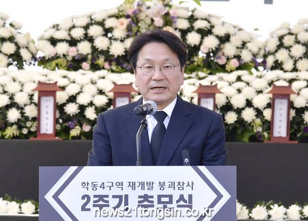 강 시장은 이날 학동4구역 재개발 붕괴참사 2주기 추모식에서 참석해 “2021년 6월 9일 바로 이곳에서 우리의 평범한 일상이 참사로 무너졌다. 학동참사는 무고할 뿐 아니라 무관한 시민들의 소중한 생명을 앗아간 재개발 역사에서 다시는 되풀이 되지 말아야 할 참사”라며 이같이 말했다.