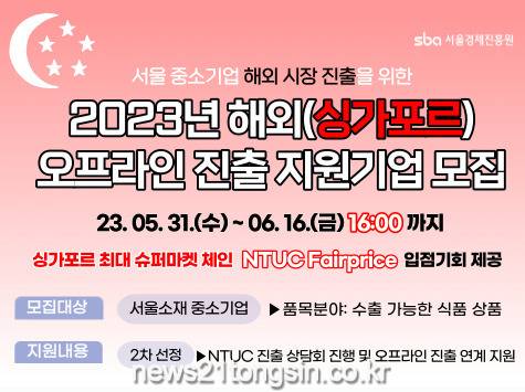 서울시 중소기업의 해외 마케팅 및 수출 판로 확대를 지원하는 서울경제진흥원(SBA, 대표이사 김현우)은 6월 16일(금) 16:00까지 중소기업 해외 진출 프로그램인 ‘2023년 해외(싱가포르) 오프라인(NTUC) 진출 지원사업’의 참가기업을 모집한다고 밝혔다.