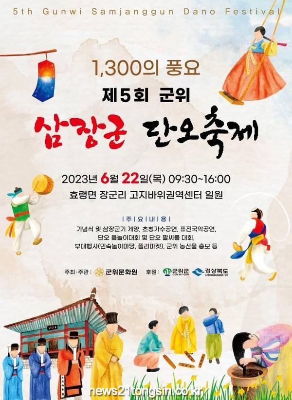 군위군은 오는 22일(음력 5월 5일) 효령면 장군리 고지바위권역 다목적센터 일원에서 제5회 군위 삼장군단오제를 개최한다고 밝혔다.
