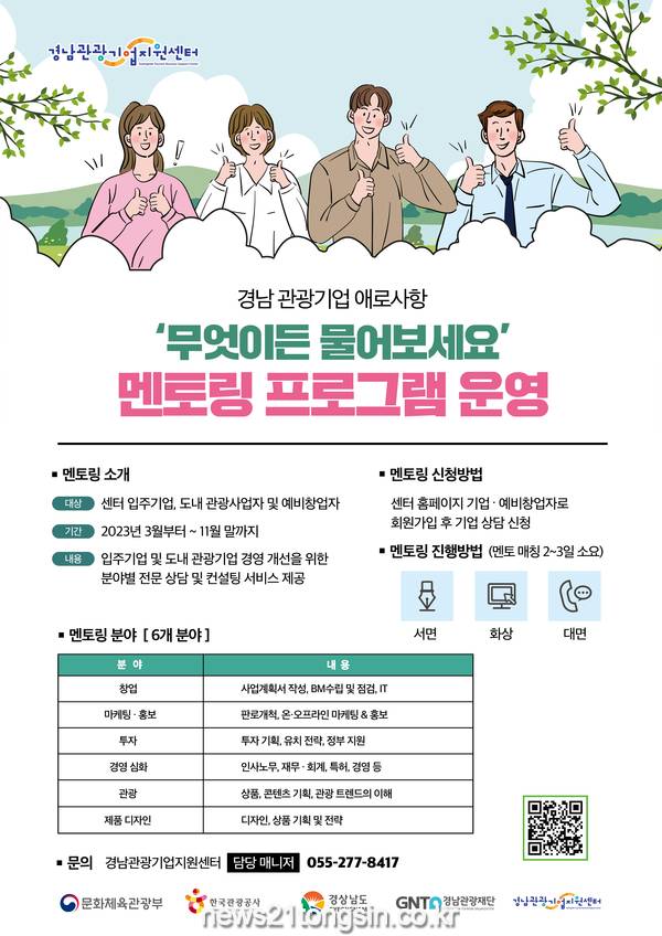멘토링 신청은 경남에 거주하는 관광 분야의 예비창업자 및 도내 관광기업이면 올해 11월 말까지 경남관광기업지원센터 누리집(https://gyeongnam.tourbiz.or.kr/)을 통해 누구나 신청할 수 있다.
