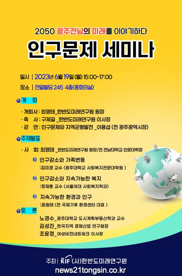 한반도미래연구원 (이사장 구제길, 원장 최영태)은 6월19일(월)오후3시 전일빌딩 4층 중회의실에서 인구문제 세미나 “2050 광주전남의 미래를 이야기하다”를