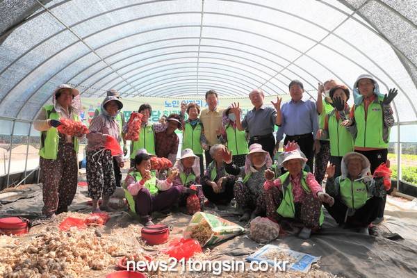진서면 석포마을 노인일자리 영농사업단은 20명의 어르신들이 참여해 1,000평의 밭에 마늘, 양파를 생산해 로컬푸드 등을 통해 판매 후 수익금을 나눠 어르신들의 소득원이 되고 있다.