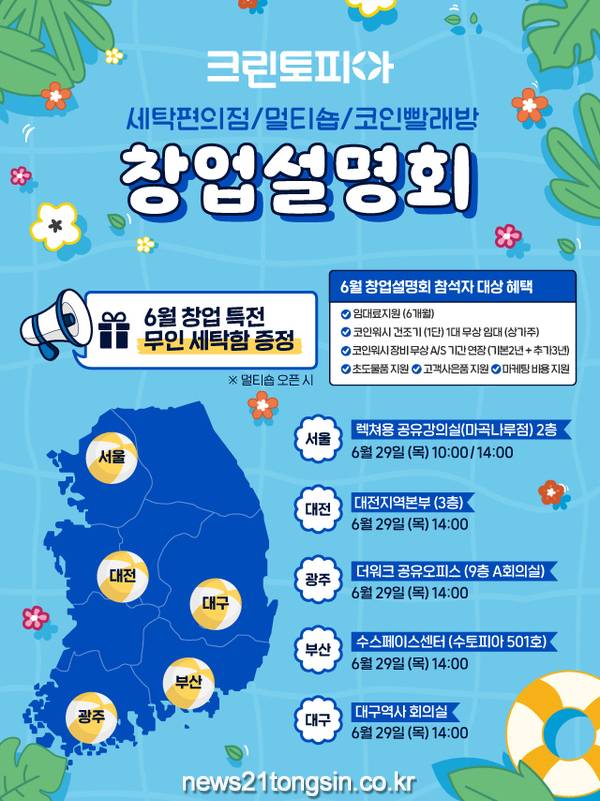 세탁 전문 기업 크린토피아가 6월 29일 전국 5개 도시에서 6월 창업설명회를 진행한다.