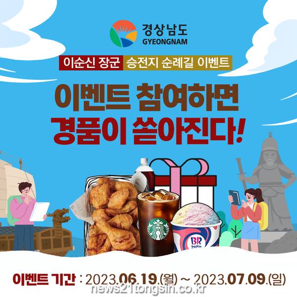 경남도(도지사 박완수)는 오는 7월 9일까지 임진왜란 당시 주요 승전지와 지역 관광 자원을 연계한 ‘이순신장군 승전지 순례길 관광상품’을 홍보하기 위한 온라인 이벤트를 진행한다고 밝혔다.