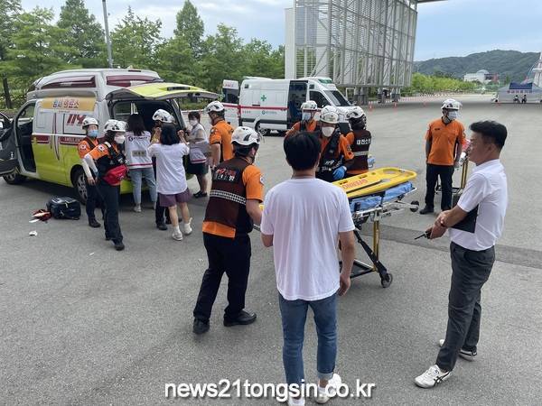 이번 훈련은 엑스포시민광장 내 미디어큐브동 붕괴 및 화재 사고로 다수 사상자(모의환자 70여명)가 발생한 상황을 가정해 진행됐다.