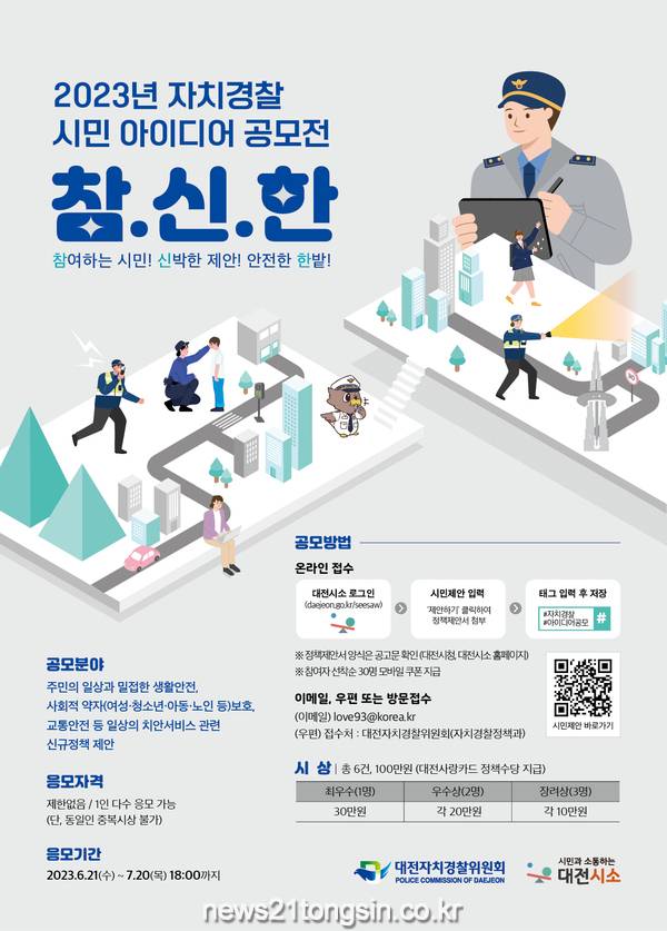 대전자치경찰위원회가 시민의 의견을 반영한 치안정책을 발굴하기 위하여 6월 21일(수)부터 7월 20일(목)까지 ‘23년 대전자치경찰 시민 아이디어(정책제안) 공모’를 실시한다고 밝혔다.
