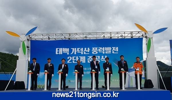 이번에 준공되는 태백가덕산 풍력발전단지는 1단계 43.2㎿ 이은 2단계 사업으로 태백시 원동 소재 가덕산에 4.2㎿급 5기, 총 21㎿의 풍력발전기가 설치되었으며, 사업비는 민자포함 총 600억원이 투입되었다.