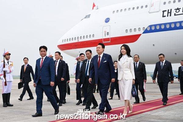윤 대통령은 주석궁으로 향하기 전, 부인 김건희 여사, 정부 관계자들과 베트남의 ‘국부’ 호찌민의 묘역을 찾아 헌화하고 참배했다.