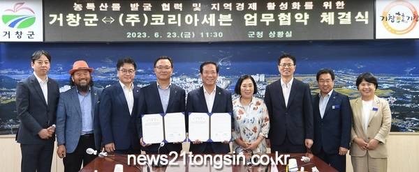 거창군은 23일 군청 상황실에서 국내 편의점업계 선도업체인 ㈜코리아세븐과 거창군 농특산물 발굴과 판로확대를 위한 업무협약을 체결했다고 밝혔다.