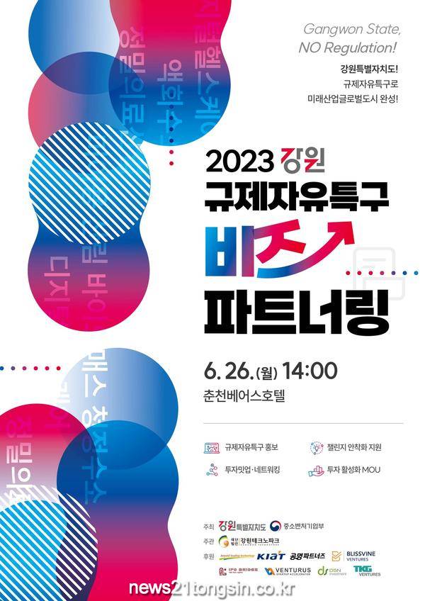 전국 최다 규제자유특구(4개)를 운영 중인 강원특별자치도는 중소벤처기업부와 함께 6월 26일 14시 춘천 오라호텔베어스 소양홀에서 「2023 규제자유특구 비즈 파트너링」행사를 개최한다.