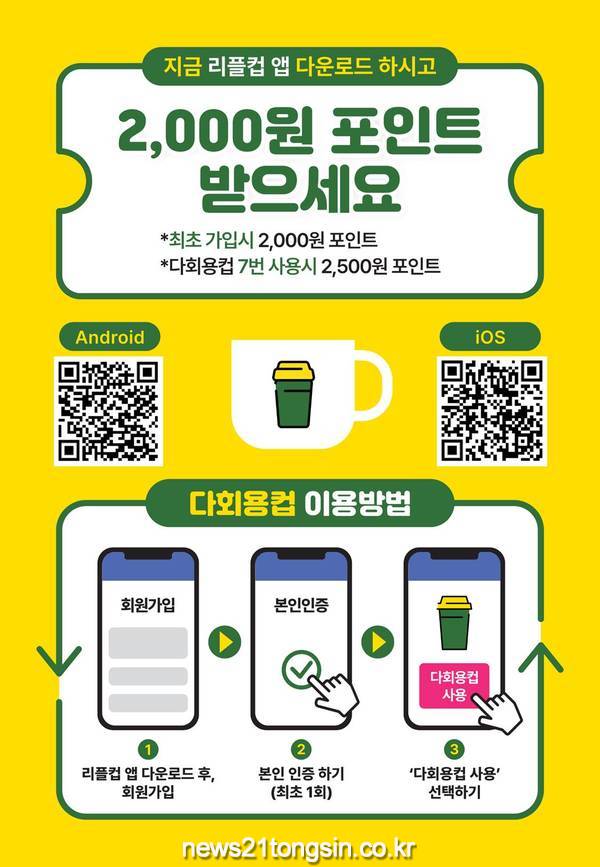 혜택은 여기서 그치지 않는다. 환경부와 한국환경공단에서 공동 운영하는 ‘탄소중립포인트(생활실천분야)’와 연계하여 다회용컵 사용 1회당 300원의 포인트가 지급된다. 사용자의 월별 다회용컵 사용실적 데이터를 한국환경공단으로 전송해 다음 달에 공단에서 일괄 정산 지급하는 방식으로 앱 업데이트를 통해 7월 중 적용할 예정이다.