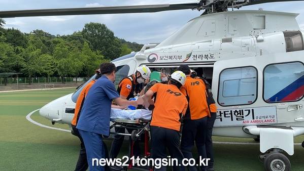 응급처치 후 신속히 인근 병원으로 이송했지만 정확한 환자 상태와 정밀검사가 필요하다고 판단하여 닥터헬기를 이용해 익산시 소재 원광대병원으로 긴급 이송했다.