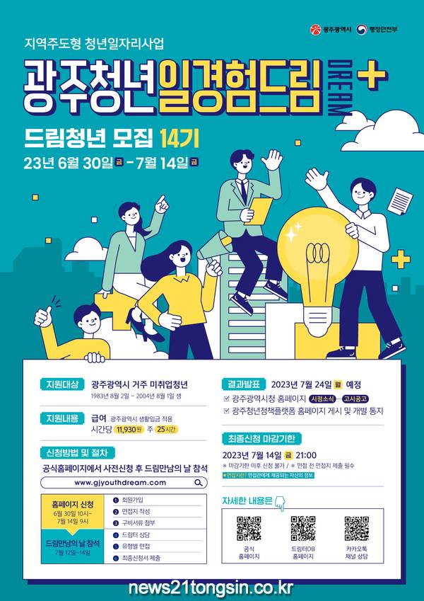 [뉴스21통신/장병기 기자] 광주광역시는 ‘광주청년 일경험드림플러스’ 사업을 통해 일경험에 참여할 제14기 드림청년 335명을 모집한다.
