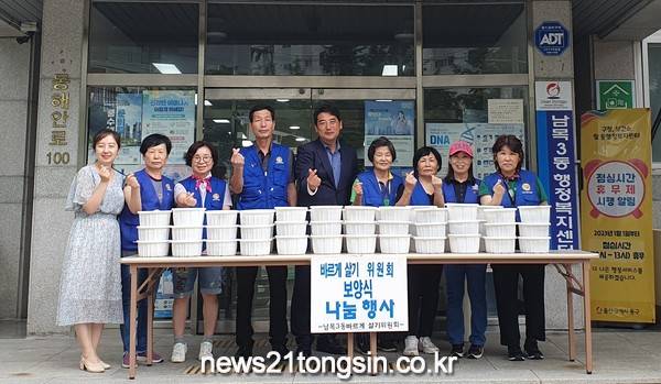 (뉴스21통신/임정훈기자) = 울산 동구 남목3동 바르게살기위원회는 6월 29일 오후 2시 동 행정복지센터에서 위원 8명이 참여한 가운데, 관내 저소득 가구에 보양식을 전달하는 행사를 가졌다.