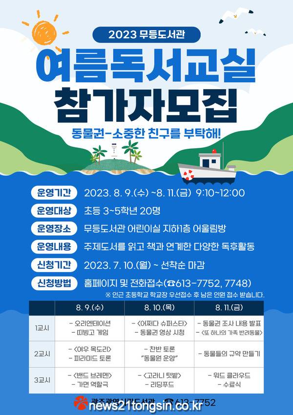[뉴스21통신/장병기 기자] 광주광역시립도서관(무등·사직·산수)은 여름방학을 맞은 초등학생을 대상으로 세 가지 주제의 ‘여름독서교실’을 운영한다.