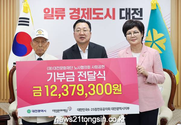 대전시-대전문화재단은 대전예술가의집에서 개최한 노사화합 플리마켓 ‘함께하장(場)’의 수익금 12,379,300원을 6.25.참전유공자회 대전광역시지부에 전액 기부했다.