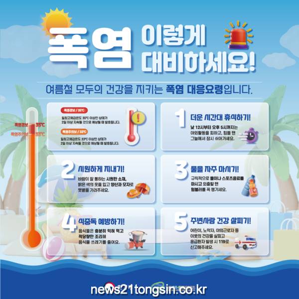 폭염 시 주요 행동요령은 ▲ 더운 시간대 휴식하기 ▲ 시원하게 지내기 ▲ 물을 자주 마시기 ▲ 식중독 예방하기 ▲ 주변사람 건강 살피기 등이다.