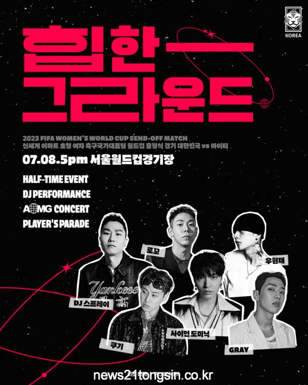 하이라이트는 경기 후 펼쳐지는 출정식이다. 현대자동차 캐스퍼, 호주관광청 제공 호주 왕복 항공권이 포함된 경품 추첨을 시작으로, 선수단 입장에 이어 정몽규 회장과 박보균 문화체육관광부장관이 격려사를 한다. 이어 대한축구협회 여자축구 메인 파트너인 신세계 그룹의 격려금 전달이 진행된다. 선수들이 대형 태극기를 들고 그라운드를 돌며 팬들에게 인사를 마치면 AOMG 아티스트들의 콘서트가 ‘힙한 그라운드’를 완성한다.