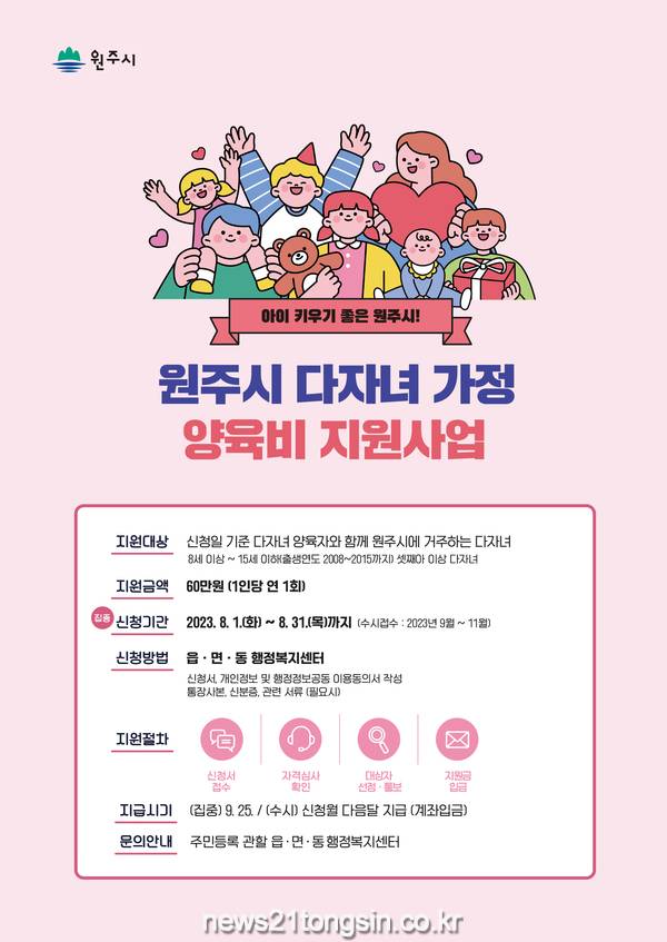 원주시가 다자녀 가정의 양육 부담을 완화하고 아이 키우기 좋은 환경을 조성하기 위해 다자녀 가정의 셋째아부터 연 60만 원의 양육비를 지원한다.