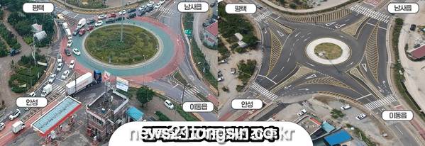 ▲ 사진=진목회전교차로 개선 전후모습 용인특례시(시장 이상일)는 출·퇴근 시간 통행량이 몰려 정체가 이어지던 처인구 남사읍 진목리 226-1번지 진목회전교차로의 차량 흐름을 원활하게 개선했다고 6일 밝혔다.