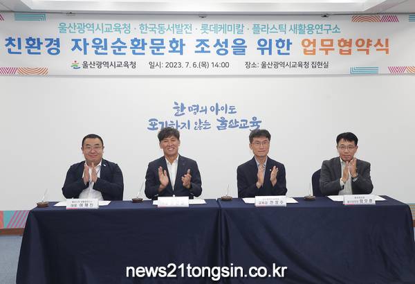 울산시교육청은 6일 한국동서발전(주), 롯데케미칼, 플라스틱 새활용연구소와 ‘친환경 자원순환 문화 조성을 위한 업무 협약’을 했다.