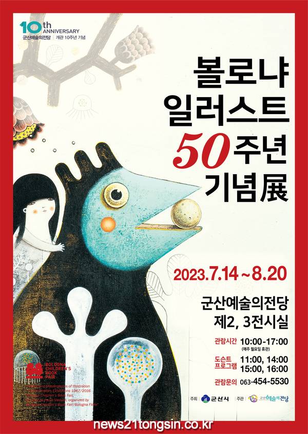 군산시예술의전당은 14일부터 8월 20일까지 33일간 제2·3전시실에서 「볼로냐 일러스트 50주년 기념전」을 개최한다고 밝혔다. 이번 전시는 ‘아동문학계의 노벨상’으로 불리는 ‘라가치상’을 받은 작품의 일러스트 약 50여점을 한눈에 볼 수 있는 기회를 제공한다.
